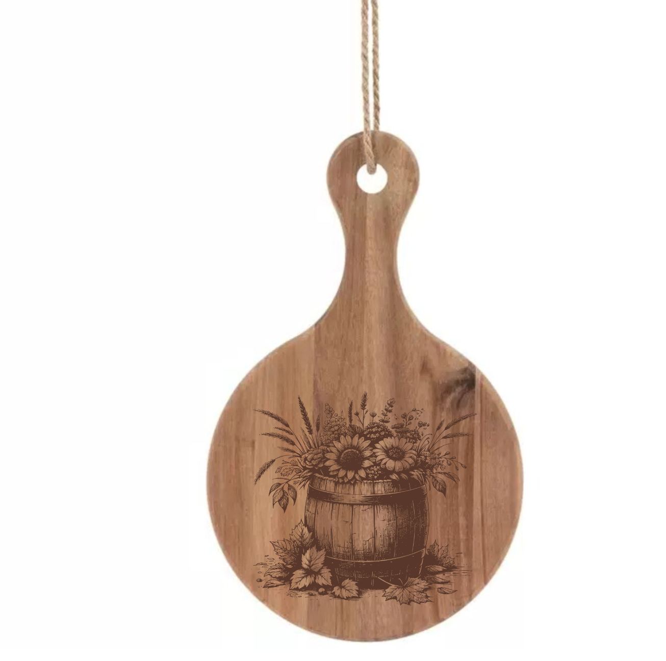 Bring timeless character and everyday functionality to your home with this beautifully laser-engraved barrel of flowers design. Each piece is crafted from richly toned acacia wood, showcasing unique grain patterns that make every item truly one-of-a-kind. The smooth finish and detailed engraving highlight both the artistry of the flower motif and the natural warmth of the wood.