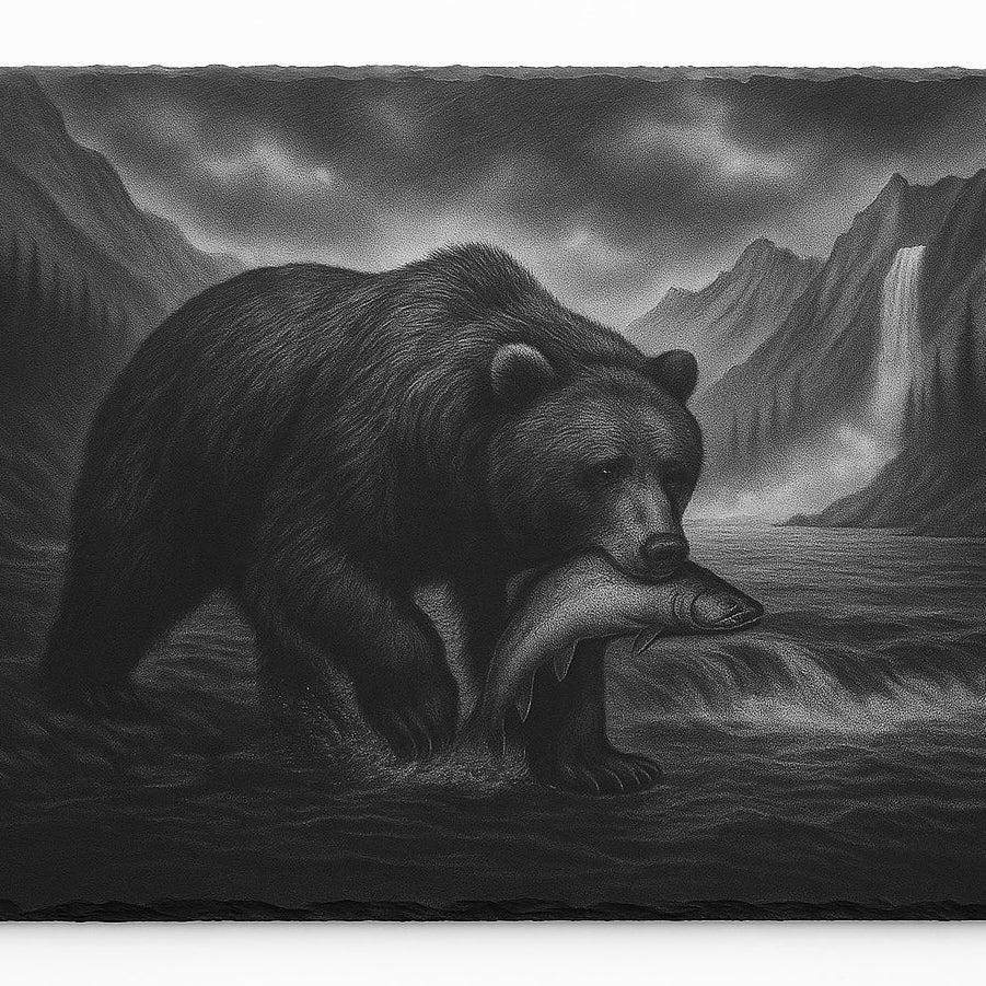 Bring a touch of rustic sophistication and handcrafted detail to your table with this beautifully laser-engraved bear fishing for dinner slate board. Each piece is made from natural slate, featuring its own unique texture and organic edges that make every item truly one-of-a-kind. The detailed engraving and rich slate-gray tone create a timeless balance of rugged charm and refined craftsmanship.