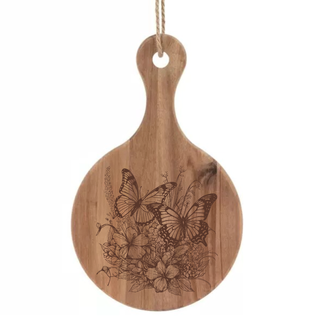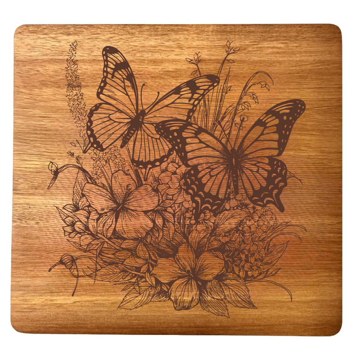 Bring timeless character and everyday functionality to your home with this beautifully laser-engraved butterflies design. Each piece is crafted from richly toned acacia wood, showcasing unique grain patterns that make every item truly one-of-a-kind. The smooth finish and detailed engraving highlight both the artistry of the butterfly motif and the natural warmth of the wood.
