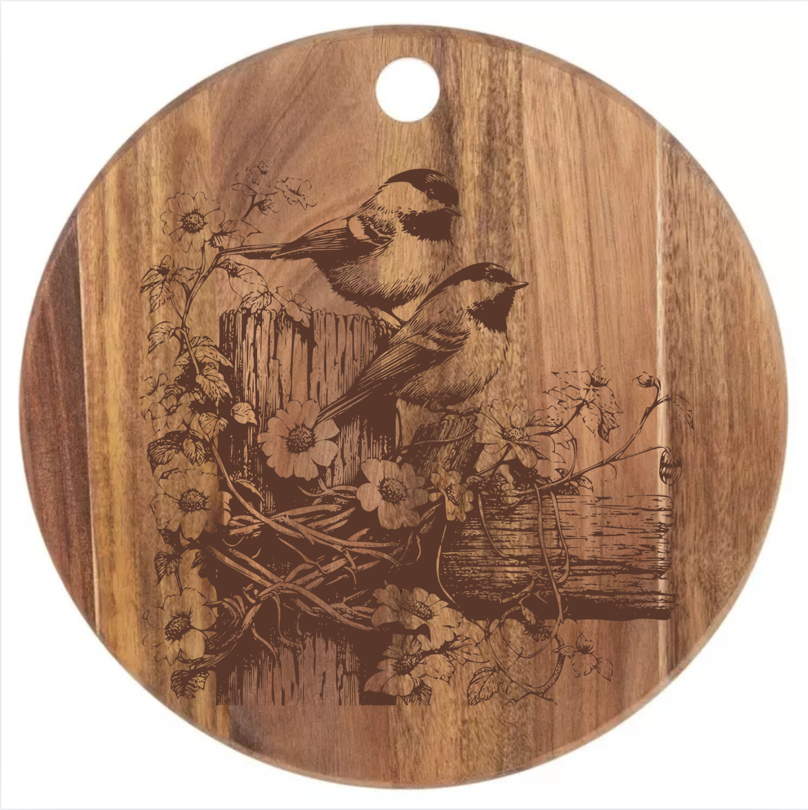 Bring timeless character and everyday functionality to your home with this beautifully laser-engraved chickadees on a fence design. Each piece is crafted from richly toned acacia wood, showcasing unique grain patterns that make every item truly one-of-a-kind. The smooth finish and detailed engraving highlight both the artistry of the chickadee motif and the natural warmth of the wood.