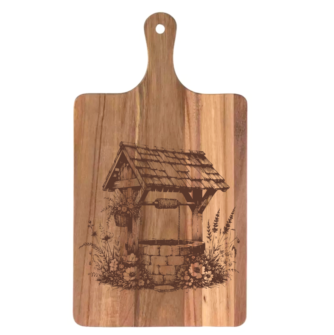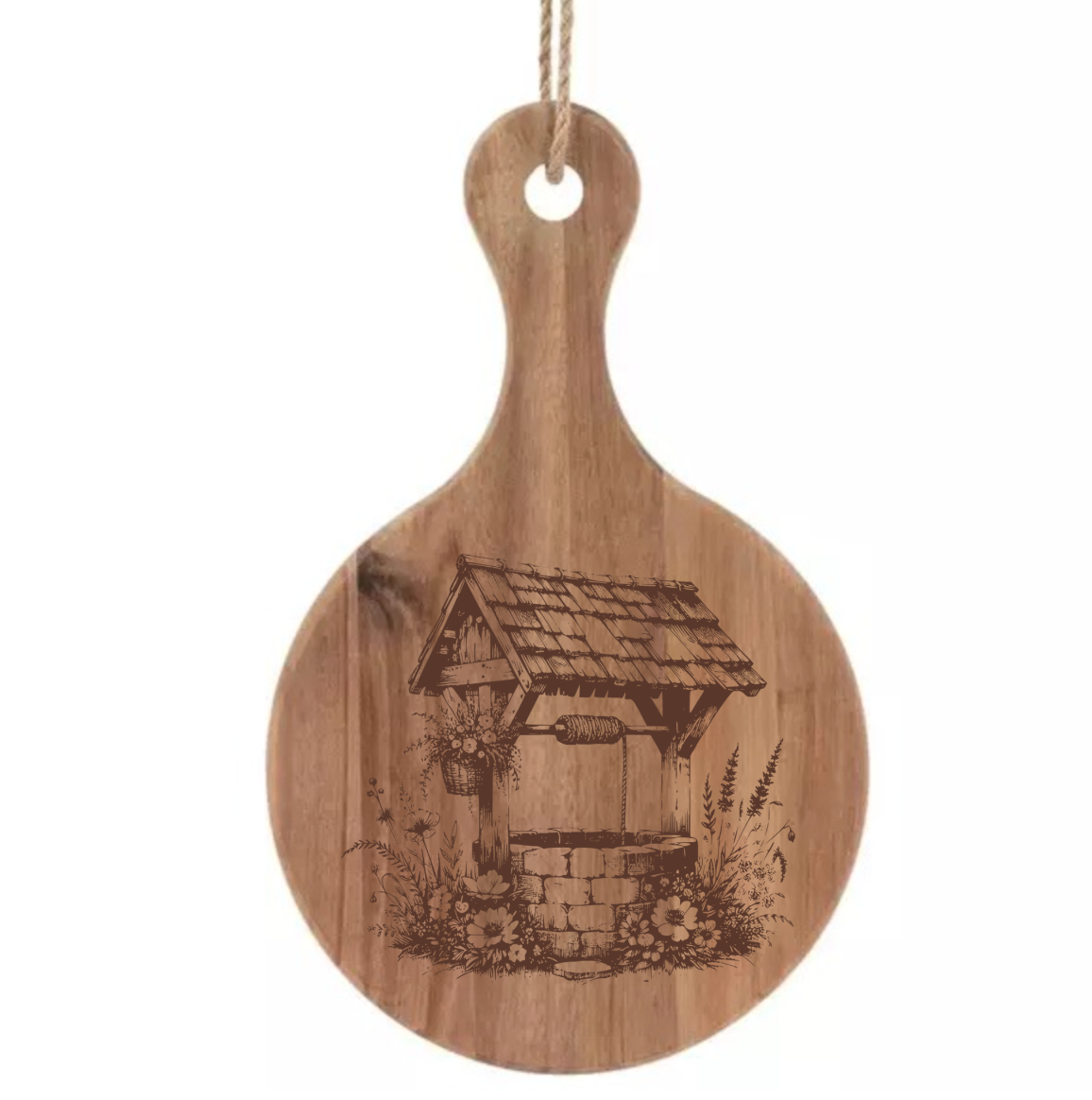 Bring timeless character and everyday functionality to your home with this beautifully laser-engraved country well design. Each piece is crafted from richly toned acacia wood, showcasing unique grain patterns that make every item truly one-of-a-kind. The smooth finish and detailed engraving highlight both the artistry of the well motif and the natural warmth of the wood.