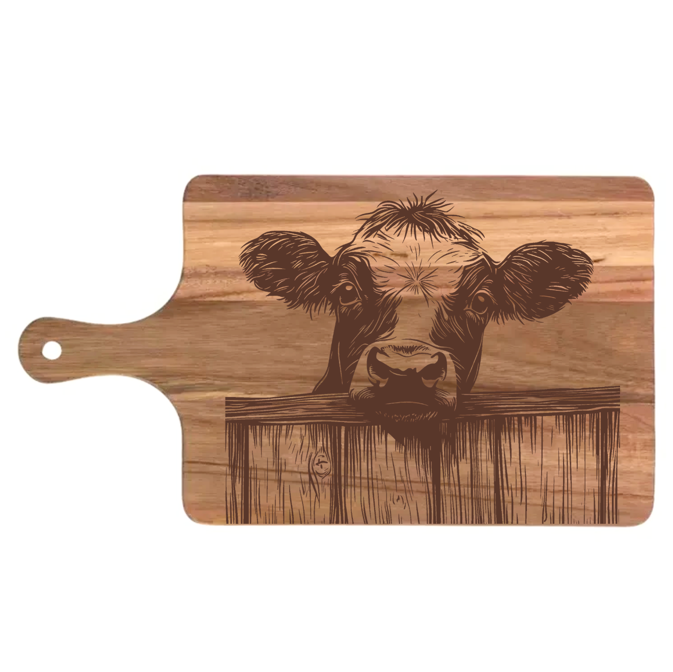 Bring timeless character and everyday functionality to your home with this beautifully laser-engraved cow peering over fence design. Each piece is crafted from richly toned acacia wood, showcasing unique grain patterns that make every item truly one-of-a-kind. The smooth finish and detailed engraving highlight both the artistry of the cow motif and the natural warmth of the wood.