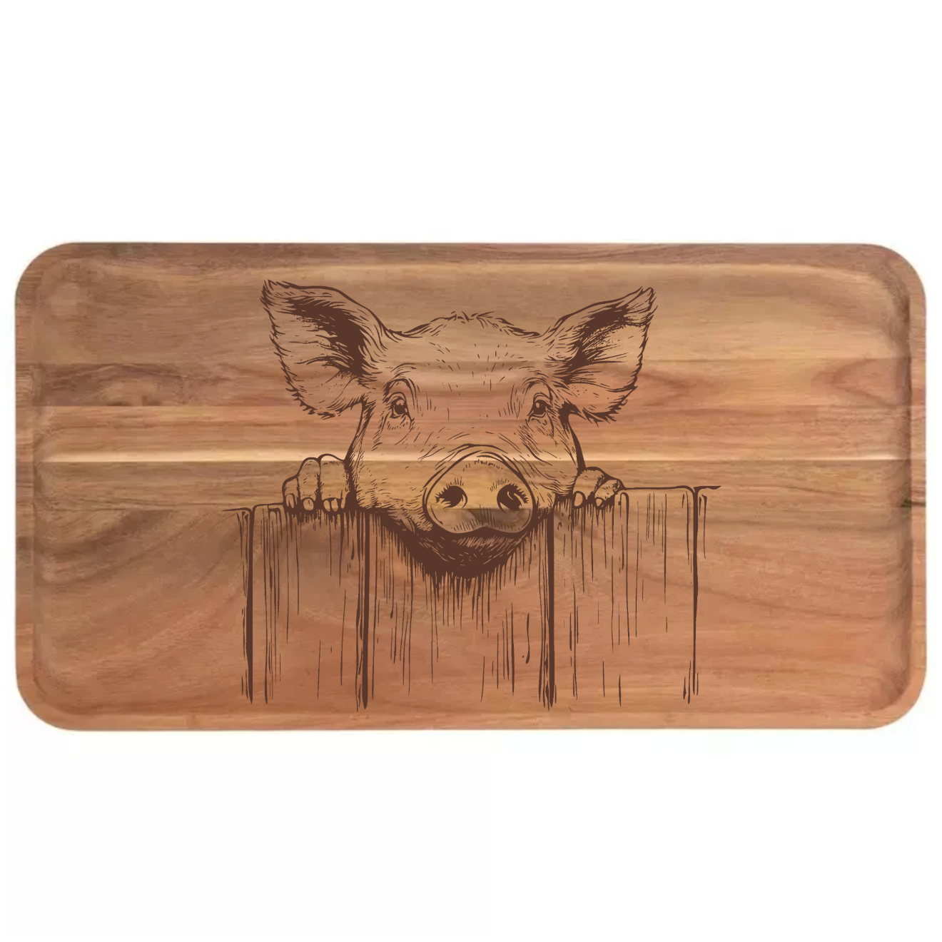 Bring timeless character and everyday functionality to your home with this beautifully laser-engraved pig peering over fence design. Each piece is crafted from richly toned acacia wood, showcasing unique grain patterns that make every item truly one-of-a-kind. The smooth finish and detailed engraving highlight both the artistry of the pig motif and the natural warmth of the wood.