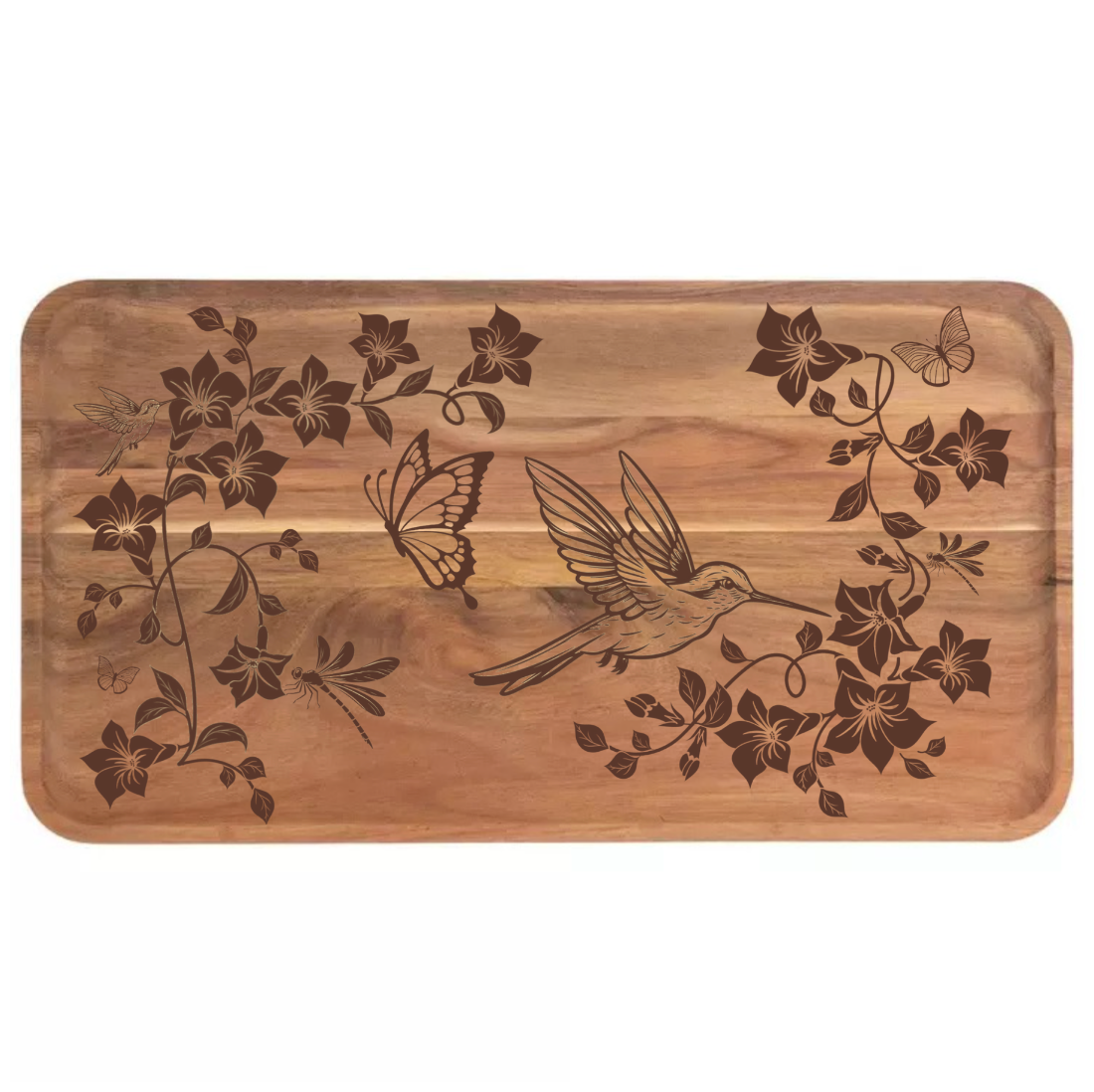 Bring timeless character and everyday functionality to your home with this beautifully laser-engraved hummingbird design. Each piece is crafted from richly toned acacia wood, showcasing unique grain patterns that make every item truly one-of-a-kind. The smooth finish and detailed engraving highlight both the artistry of the hummingbird motif and the natural warmth of the wood.