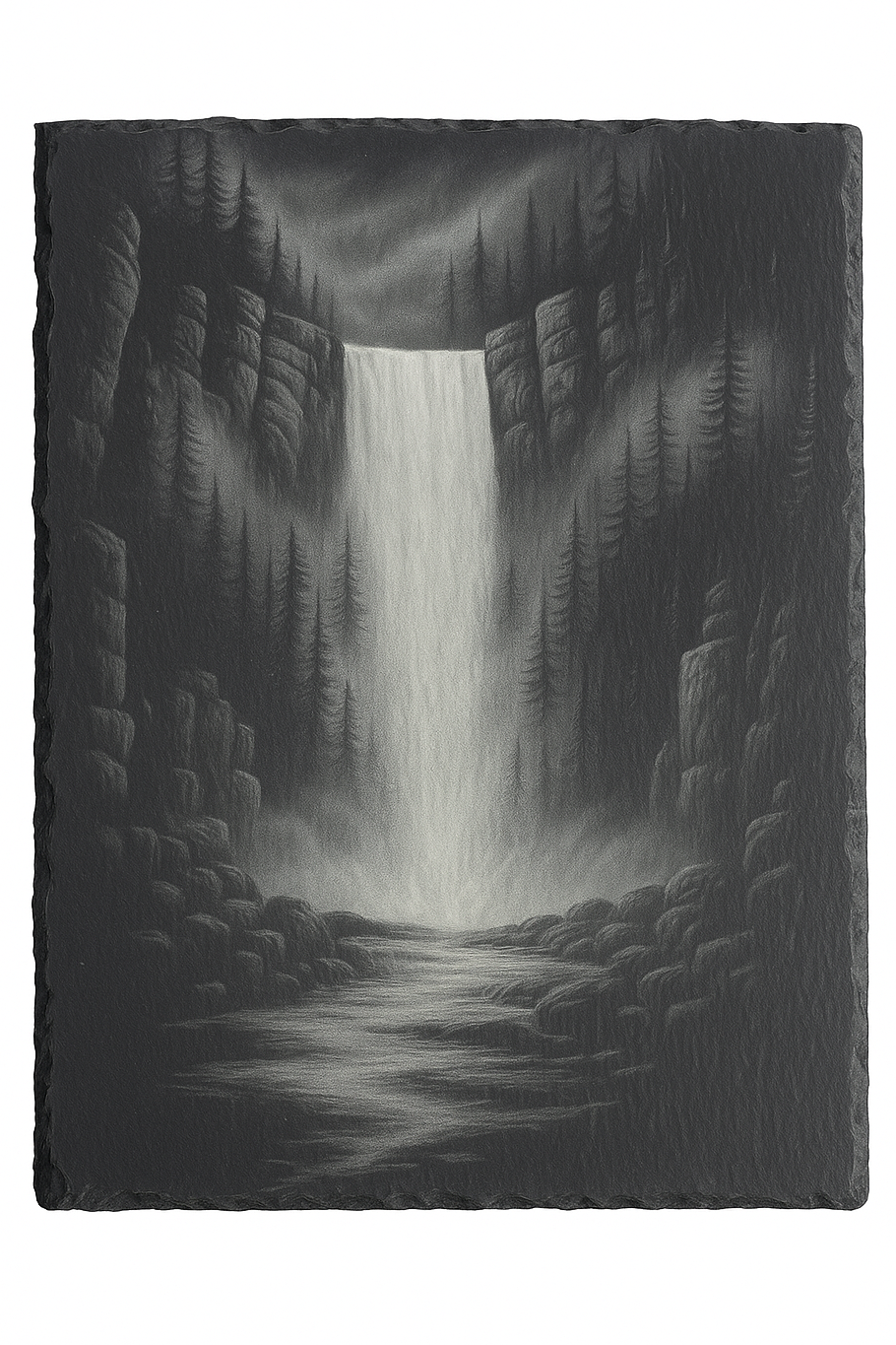 Bring a touch of rustic sophistication and handcrafted detail to your table with this beautifully laser-engraved waterfall slate board. Each piece is made from natural slate, featuring its own unique texture and organic edges that make every item truly one-of-a-kind. The detailed engraving and rich slate-gray tone create a timeless balance of rugged charm and refined craftsmanship.